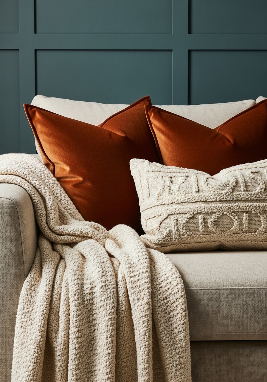I painted one wall deep teal and kept the rest warm white. The teal anchors the room. I layered a cream chunky knit throw and rust velvet pillows to echo the accent color. Tip: use a 2:1 texture ratio — two soft textures to one smooth. Works because the bold color is balanced by natural materials like jute and linen. Mistake to avoid: painting all four walls the bold hue; it overwhelms small rooms. Brands I gravitate toward: West Elm for color furniture, Target for affordable pillows.