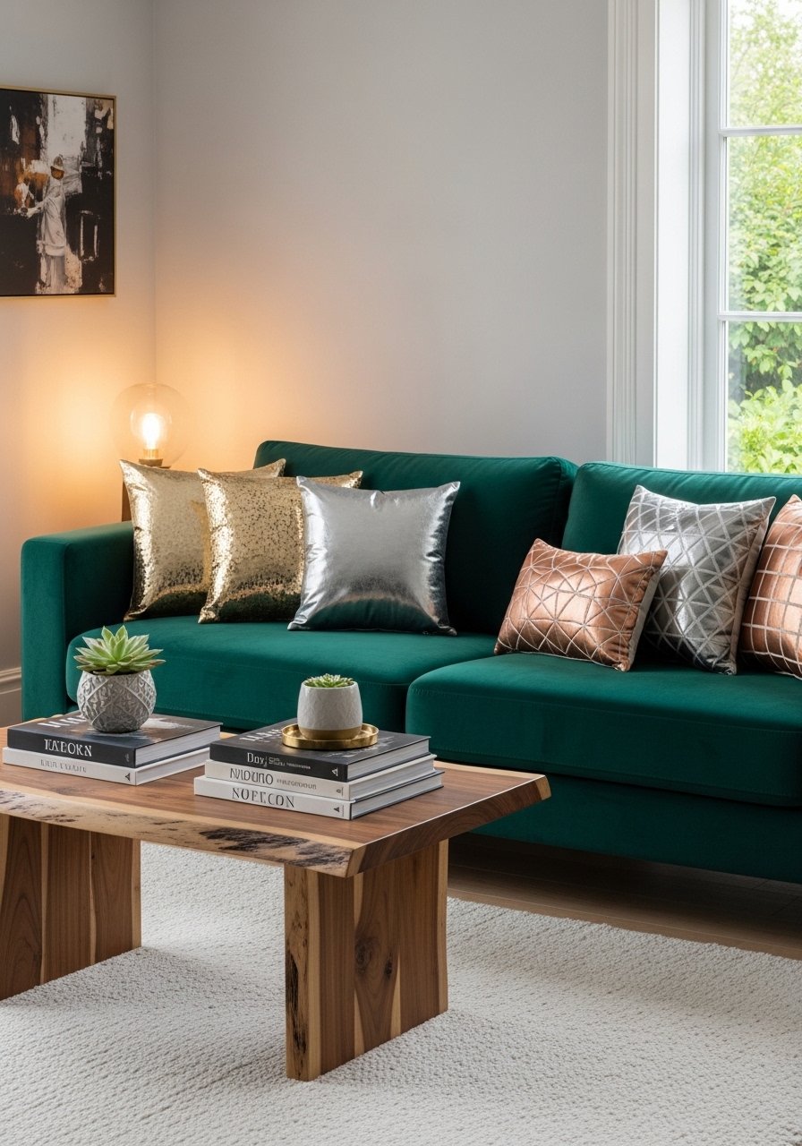 I swapped my beige sofa for an emerald velvet loveseat from a local showroom. The color set the whole palette. Velvet adds depth and reads luxe in photos and real life. Pair with warm brass lamps and a 36-inch round mirror behind for balance. Mistake: too many competing colors; keep at most two accent hues.