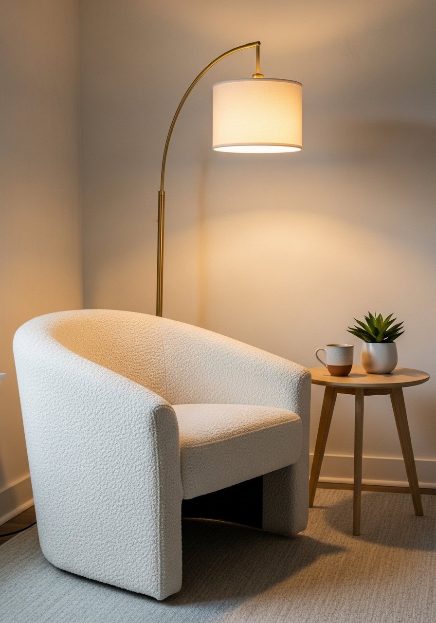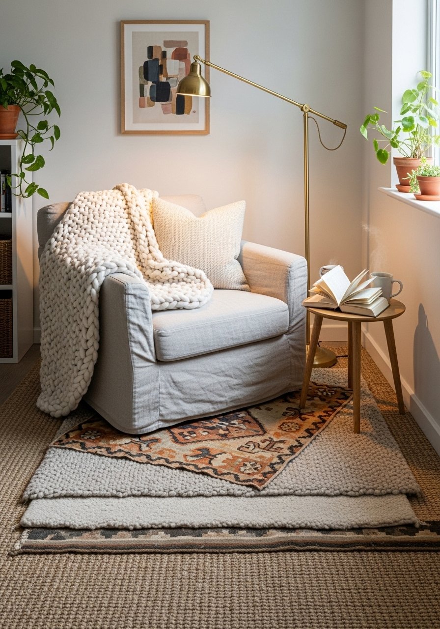 A plush chair, layered rug, and warm light change a corner into a retreat. I drape this cream throw and add a sculptural lamp. Mistake: using only one texture; aim for at least three.