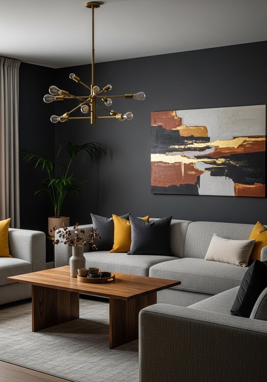 Dark charcoal walls read cozy with walnut and brass. I balance with off-white textiles and a jute rug 8×10. Dark walls hide flaws and make color furniture pop. Mistake: low lighting — always layer lamps.