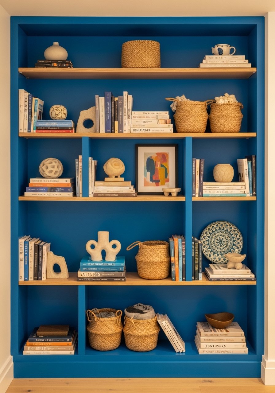 Painting the back of shelves a saturated hue frames objects. I use navy to make pottery and brass sing. Keep shelf styling 60% open space, 40% objects. Mistake: overcrowding shelves; edit ruthlessly.