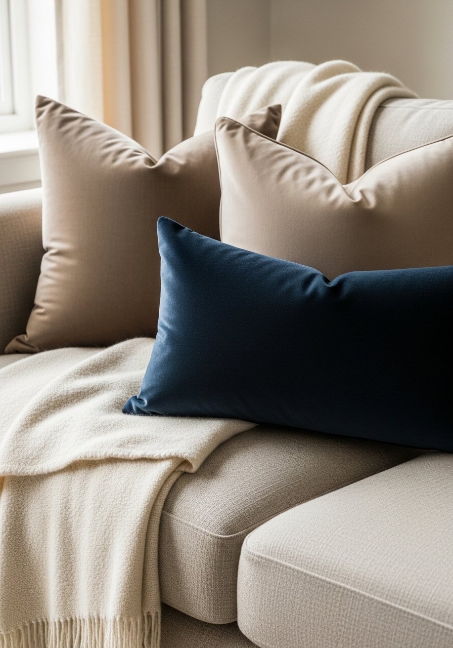 I layered cream, oat, and warm gray textiles, then added a single deep navy pillow for contrast. I used this chunky cream throw and velvet pillow covers. The trick: keep texture ratio about 2:1 (smooth vs. nubby) and use odd numbers for accessories. This reads high-end in photos and in person. Mistake to avoid: too many competing accent colors—stick to one bold color only.