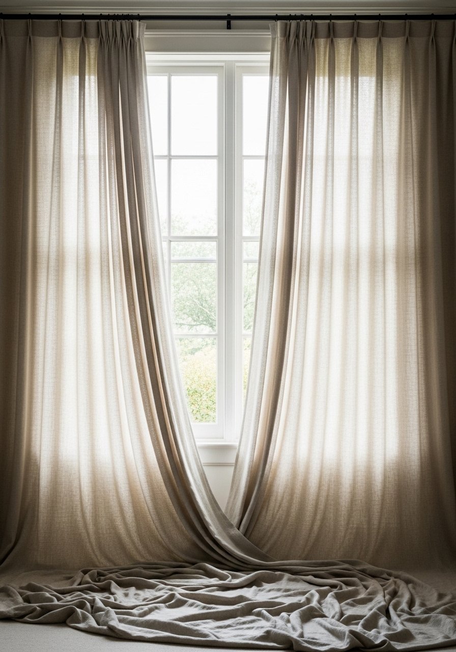 Hanging linen blend curtains, 96-inch close to the ceiling makes ceilings feel taller. I mount rods 4–6 inches above the window trim. Choose light-filtering fabrics for soft glow. Common mistake: hanging too low—short curtains visually cut the wall.