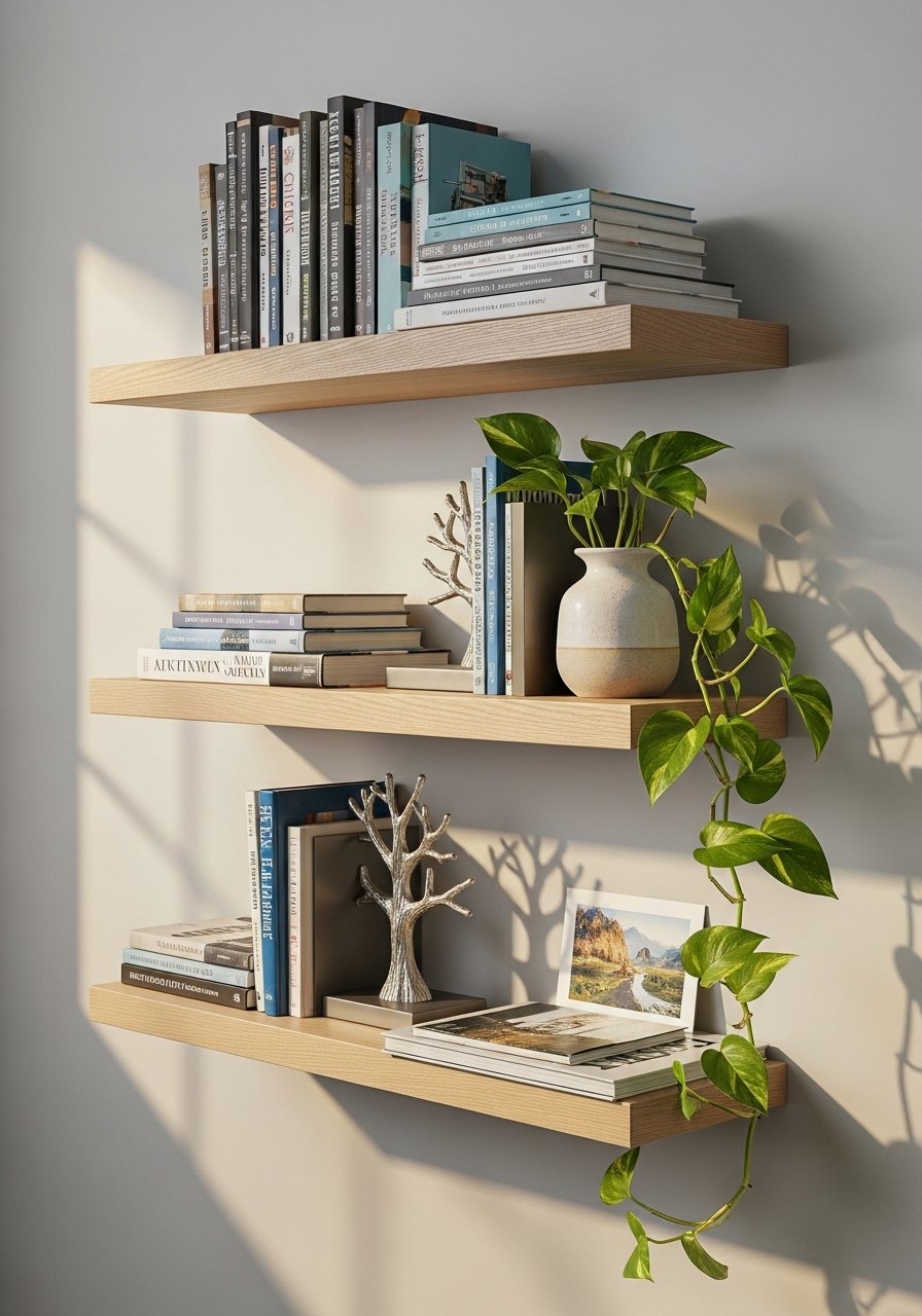 I installed white oak floating shelves and styled them with odd-number groupings: two books, one plant, one candle. Add a faux 6ft fiddle leaf fig for height. Avoid centering everything; offset items for a lived-in feel.