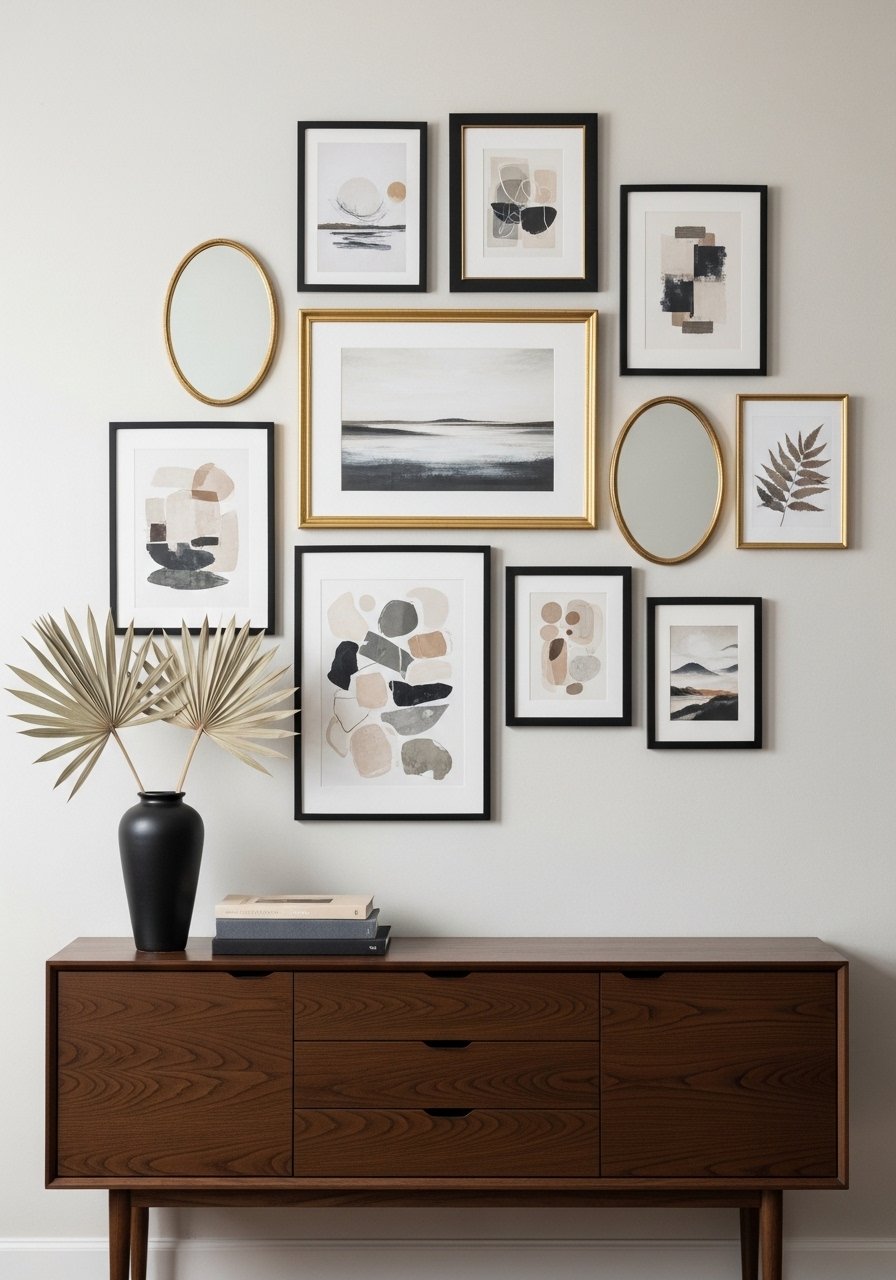 I collected frames from thrift stores and balanced them with new white mats and a few new brass frames. The rule I follow: start with the largest piece and work outward. Mistake: overfilling frames—give artwork breathing room.