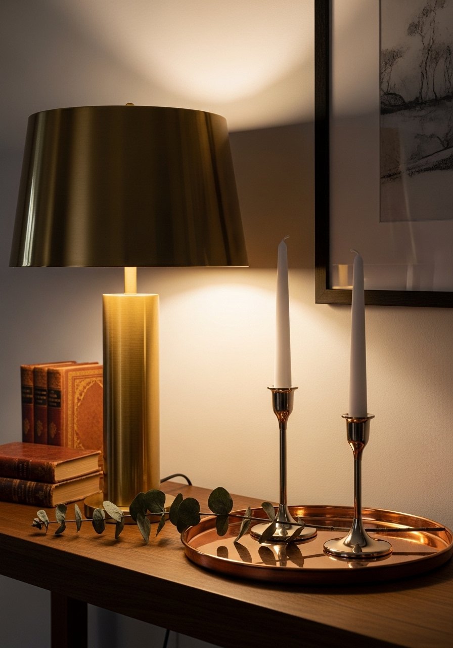 I pair warm brass lamps with nickel frames and a copper tray for depth. Try mixed metal frames to make mixing easy. Keep metals limited to three tones max. Mistake: matching every finish—deliberate contrast reads current.
