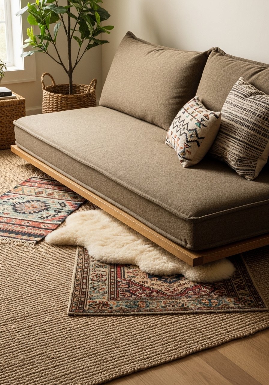My low sofa sits on an 8×10 jute rug and a softer layer on top. The mix makes the seating area feel grounded and cozy. Mistake: rug too small—front legs should sit on it.