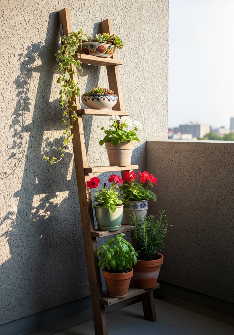 Vertical Plant Ladder for Tiny Balconies (Under-Covered Angle)