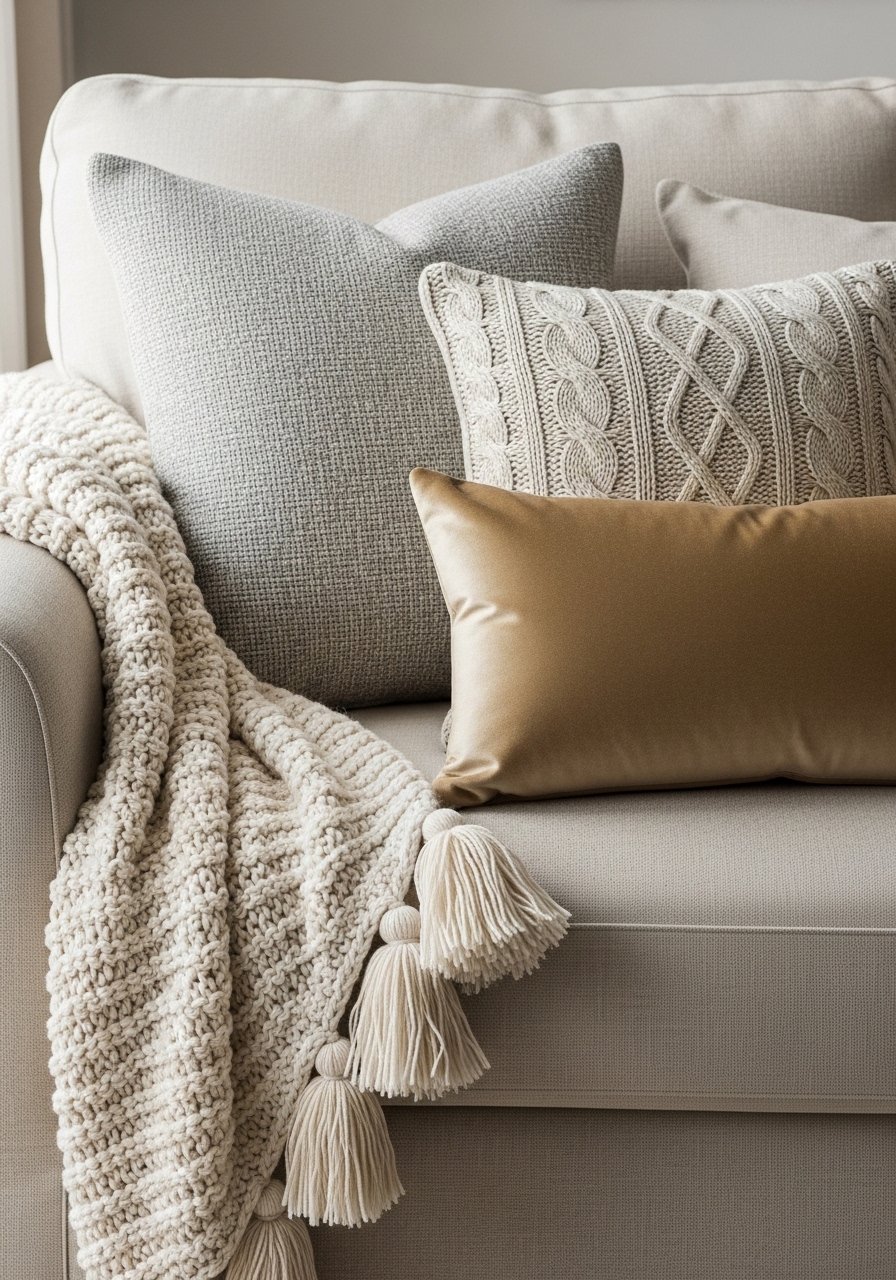 I like a neutral base and a single warm metallic to avoid the “flat beige” trap. I used velvet pillow covers in beige and muted gold on a linen sofa and added a matte gold tray on the coffee table. The result reads calm and curated. Styling rule: odd numbers—three pillows, one gold object, and a stack of two books. Mistake to avoid: too many shiny pieces; choose matte or brushed gold for subtlety.