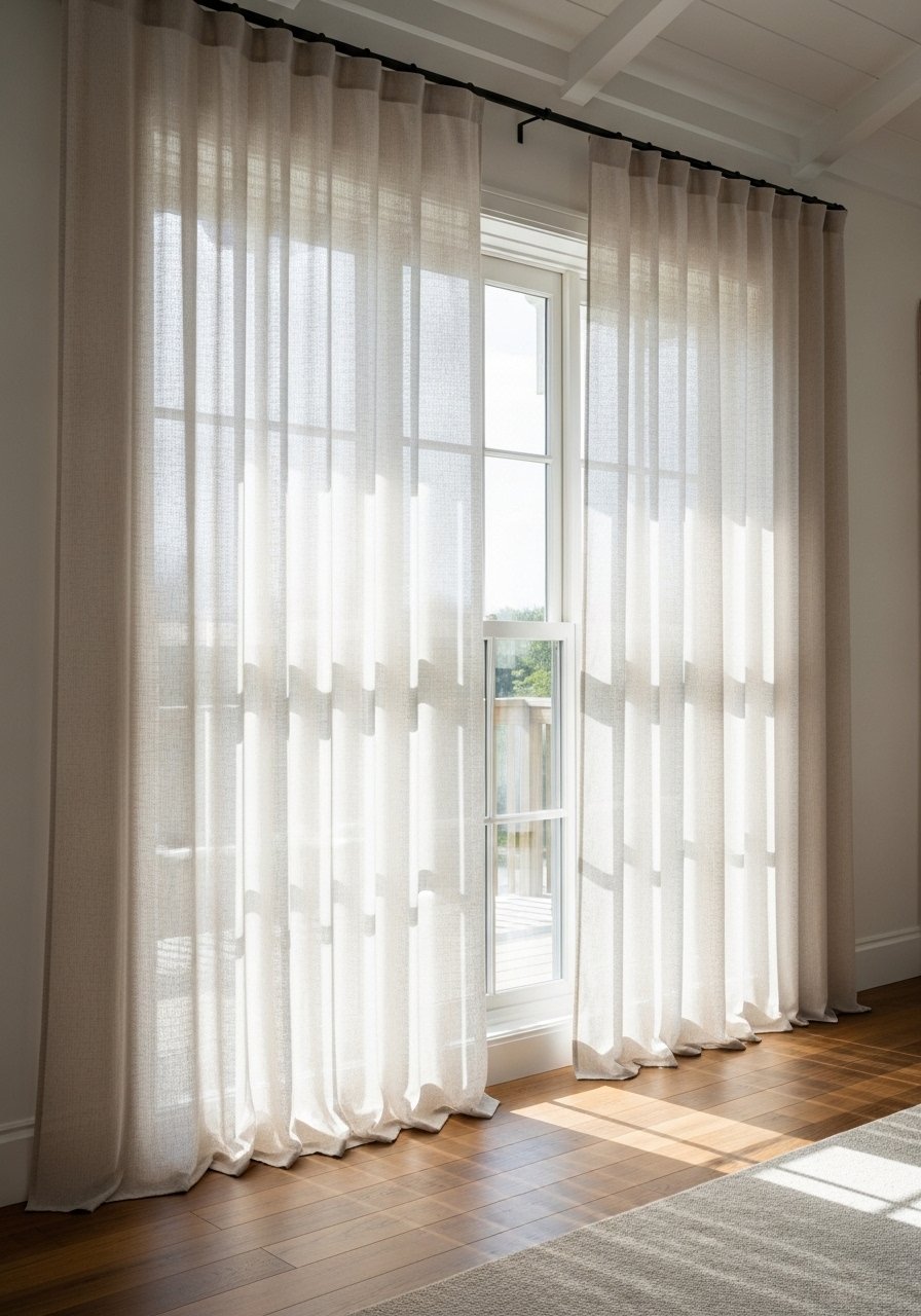 Hanging linen blend curtains 4–6 inches above the frame creates instant height. I paired them with slim matte gold rods for warmth. This trick brightens and makes rooms feel bigger. What looks good in photos—super sheer only—can feel drafty in real life; choose a heavier linen blend if you need privacy.
