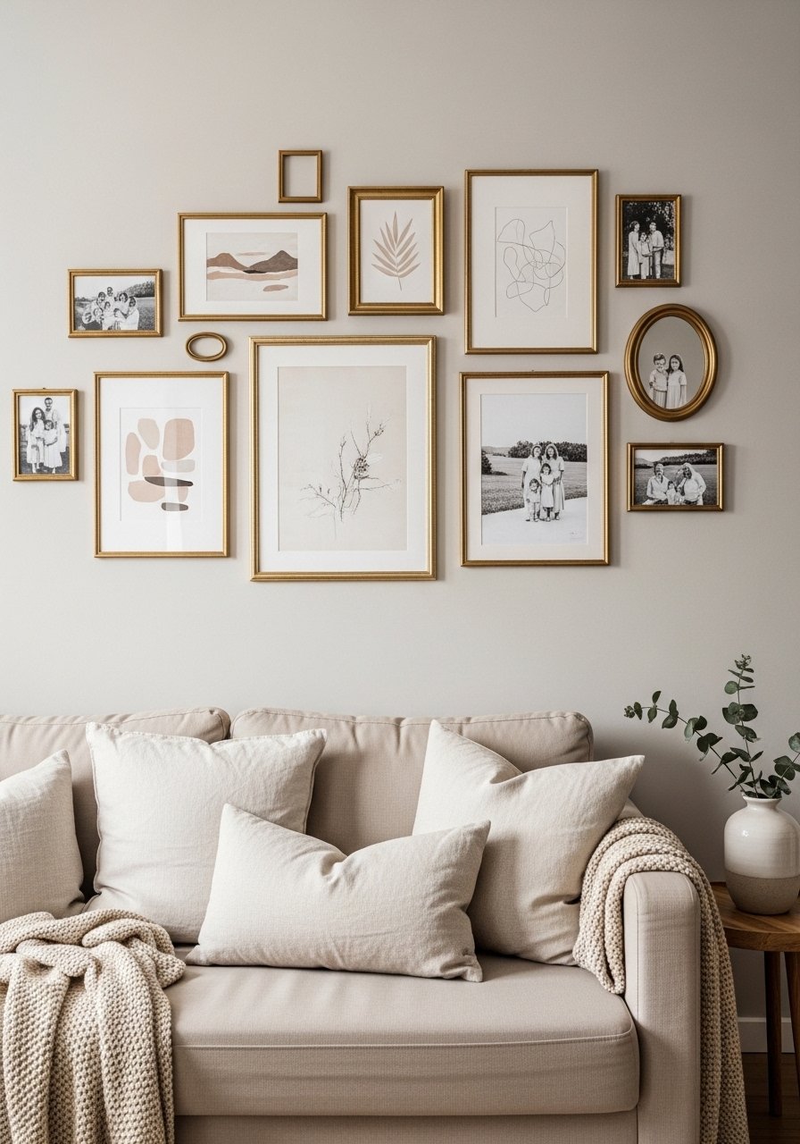 I framed prints and family photos in brass frames 8×10 and kept mats white for cohesion. Stick to a 2:1 ratio of art to empty wall. I avoided colorful art—beige and soft golds keep it calm. Mistake: spacing inconsistently; use kraft paper templates to map before hanging.
