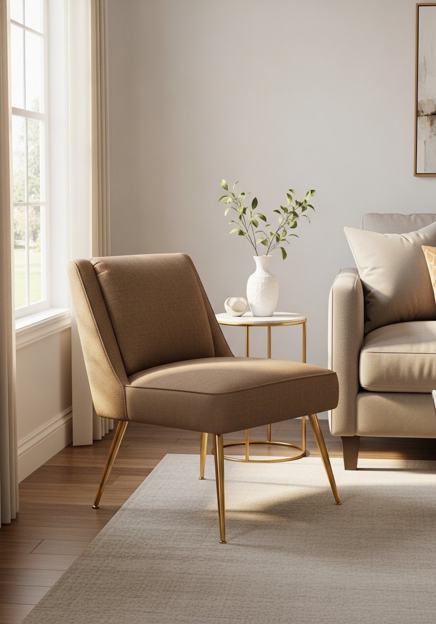 Swap one seating piece for a slightly darker taupe chair to add depth. I found an affordable taupe upholstered accent chair with gold legs that grounds the sofa. Use a 2:1 texture balance—two soft textiles to one smooth surface. Avoid matching everything too closely; contrast gives dimension.