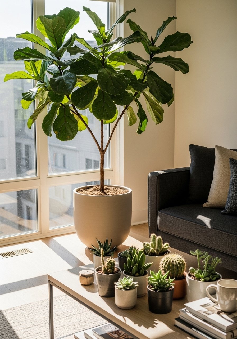 Plants break beige monotony. I use a 6ft artificial fiddle leaf fig in a matte ceramic planter plus small real succulents. Tip: pick one large plant and 1–2 smalls. Too many mismatched pots looks cluttered.