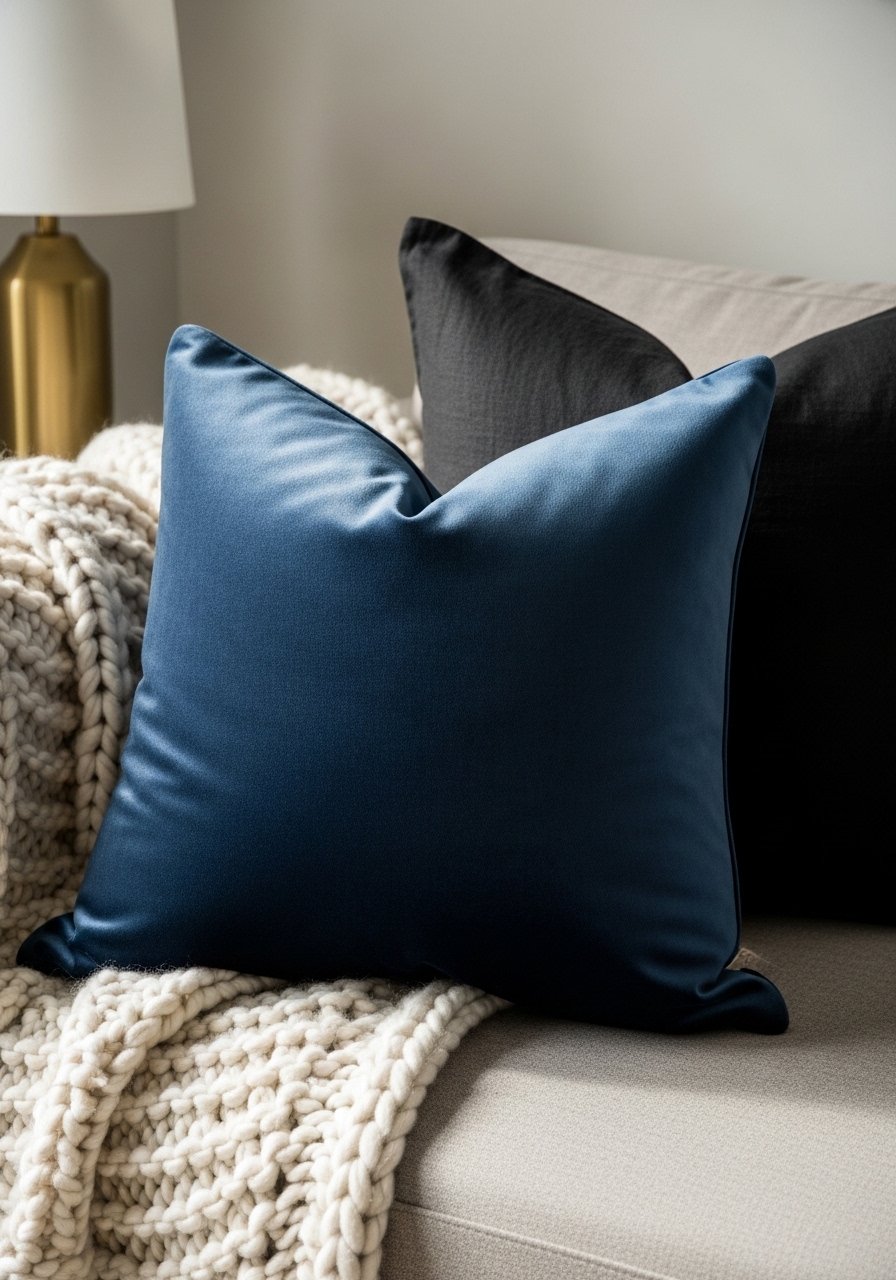 I began by swapping five pillows—two navy velvet, two black linen, one patterned blue—to anchor the couch. I use navy velvet covers and black linen covers. The rule of three and height variation matters: place a tall euro pillow behind a smaller lumbar. Avoid matching fabrics exactly; mix velvet, linen, and a woven for depth. This creates a cozy, layered look that reads intentional, not staged.