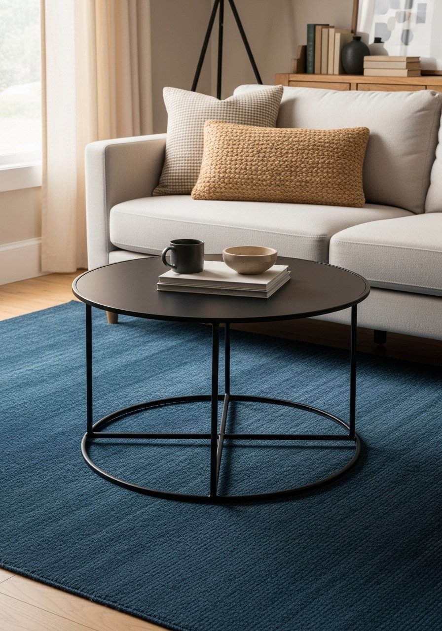 I swapped my wooden table for a black metal coffee table and layered a navy rug underneath (navy area rug 6×9). The black frame grounds the space; the blue rug pulls everything together. Keep furniture legs on or at least the front legs on the rug for cohesion. Common mistake: choosing a patterned rug that clashes—stick to muted patterns or solid blues.