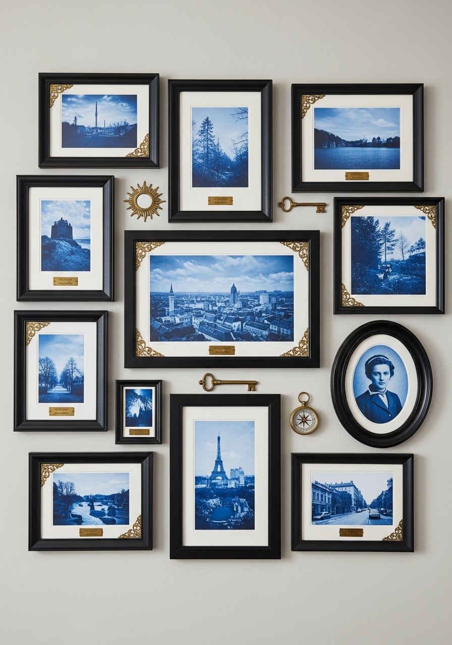 I curated a gallery of black frames filled with blue botanical prints and personal photos. Use odd-number groupings and varied sizes. I used black frames set and matted the art for polish. The result feels collected. Mistake to avoid: starting in the center and hanging unevenly—layout on the floor first.