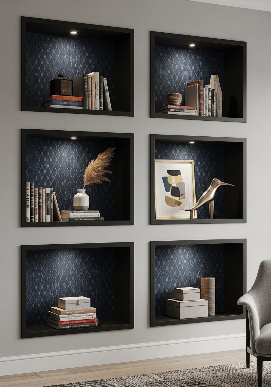 I painted my built-ins black and added peel-and-stick navy wallpaper to the backs. The contrast highlights objects and creates depth. This is a trick designers use but few mention for renters—peel-and-stick gives the same effect temporarily.