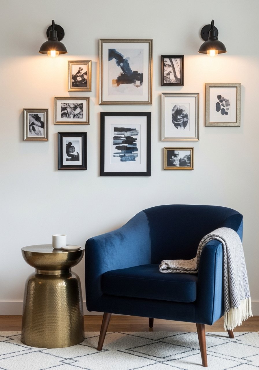 I mixed matte black fixtures, navy textiles, and warm brass lamps. Mixing metals keeps the palette from feeling flat. I used mixed metal frames and a brass table lamp. Tip: choose one metal as the anchor and let others be accents.